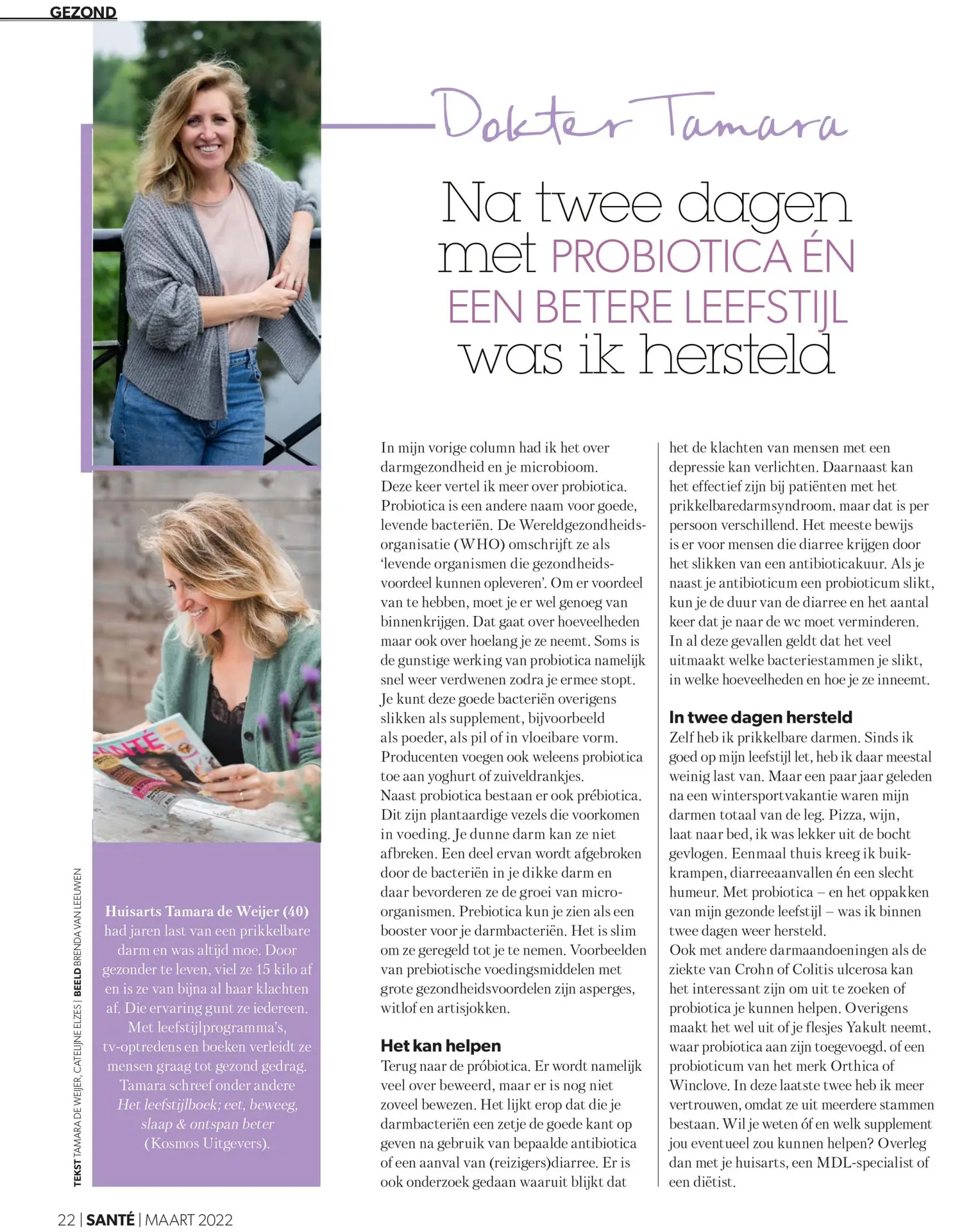 In mijn vorige column had ik het over darmgezondheid en je microbioom. Deze keer vertel ik meer over probiotica. Probiotica is een andere naam voor goede, levende bacteriën. De Wereldgezondheidsorganisatie (WHO) omschrijft ze als ‘levende organismen die gezondheidsvoordelen kunnen opleveren’. Om er voordeel van te hebben, moet je er wel voldoende binnenkrijgen. Dat gaat over hoeveelheden maar ook over hoe lang je ze neemt. Soms is de gunstige werking van protiotica namelijk snel weer verdwenen zodra je ermee stopt. Je kunt deze goede bacteriën overigens slikken als supplement, bijvoorbeeld als poeder, als pil of in vloeibare vorm. Producenten voegen ook weleens probiotica toe aan yoghurt of zuiveldrankjes.