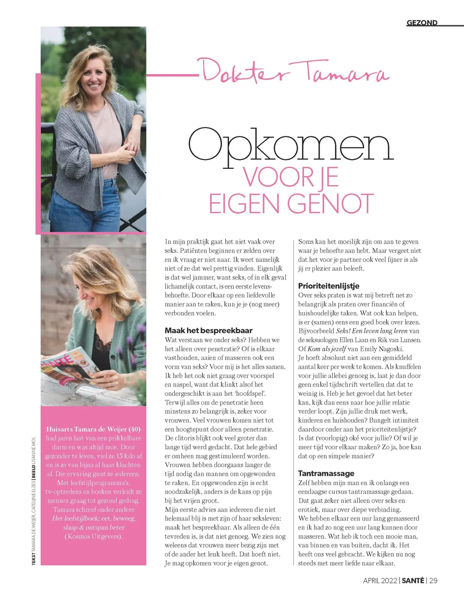 In mijn column in de Santé van deze maand heb ik het deze keer over seks. In mijn praktijk gaat het niet vaak over seks. Patiënten beginnen er zelden over en ik vraag er niet naar. Ik weet namelijk niet of ze dat wel prettig vinden. Eigenlijk is dat wel jammer, want seks, of in elk geval lichamelijk contact, is een eerste levensbehoefte. Door elkaar op een liefdevolle manier aan te raken, kun je je (nog meer) verbonden voelen.