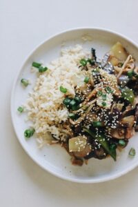 minuten. In de laatste drie minuten, voeg je ook de bloemkoolrijst toe, blijf om
